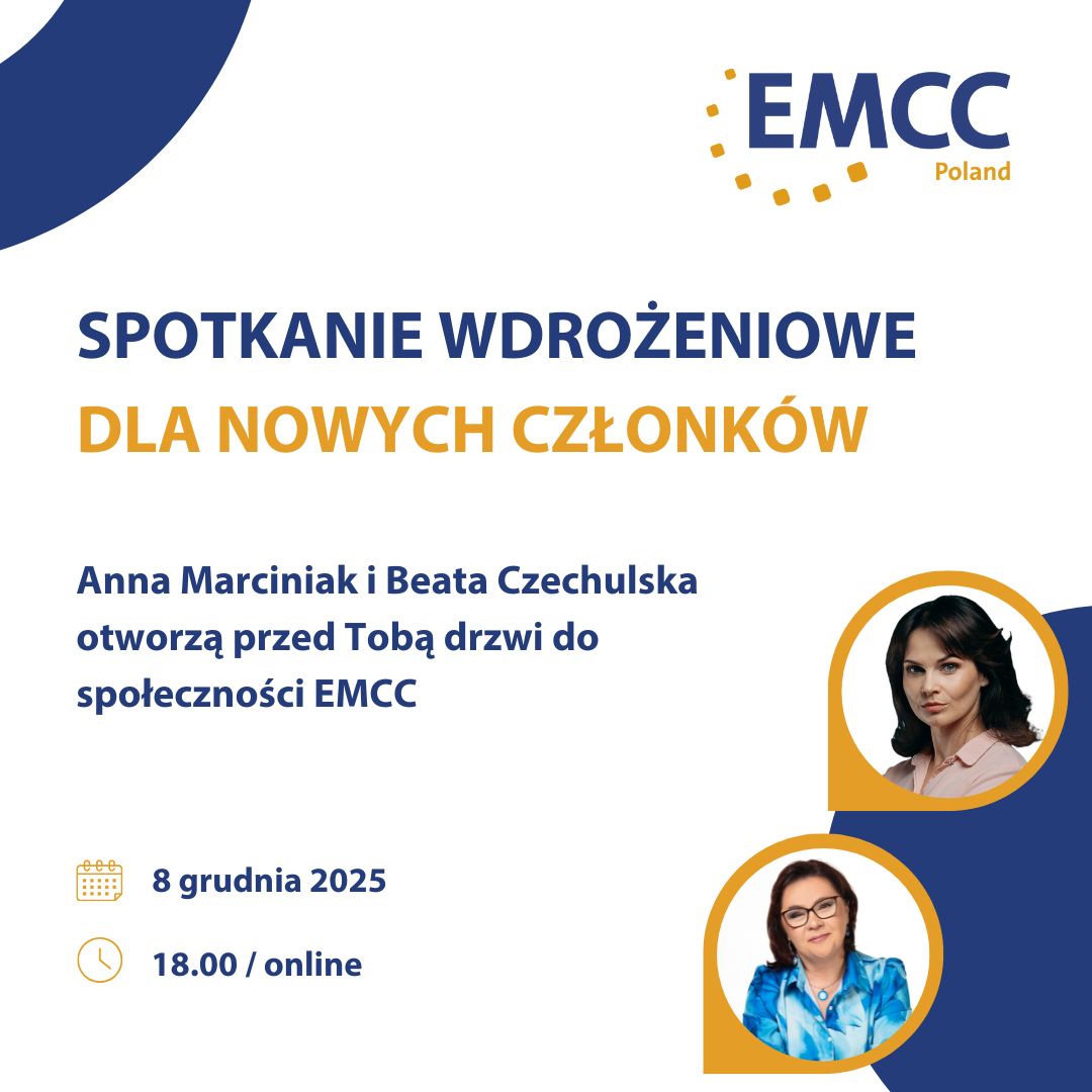 Jeśli niedawno dołączyłaś / dołączyłeś do naszego Stowarzyszenia, zapraszamy Cię na Spotkanie wdrożeniowe dla nowych Członkiń i Członków EMCC Poland, które odbędzie się 8 grudnia 2025 r. o godz. 18:00 (online).